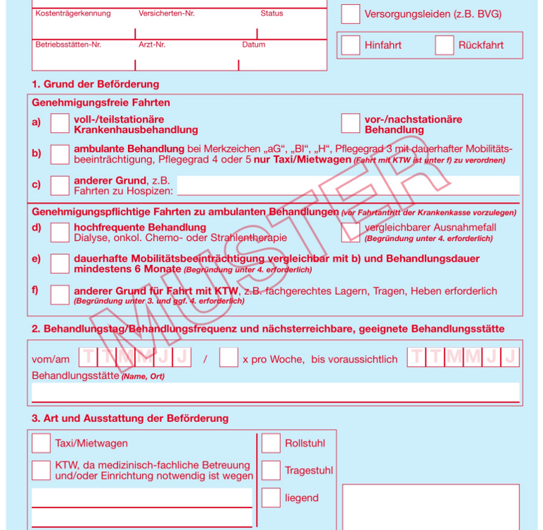 Genehmigung durch die Krankenkasse: In den meisten Fällen muss die Verordnung vor der Fahrt bei der Krankenkasse eingereicht und genehmigt werden. Dies gilt vor allem für ambulante Fahrten. Für stationäre Behandlungen oder Notfälle ist in der Regel keine vorherige Genehmigung notwendig.